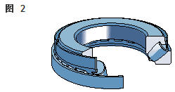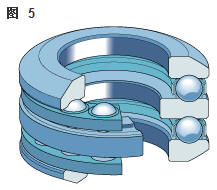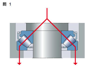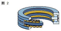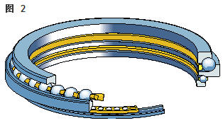 雙向角接觸推力球軸承 在雙向軸承的設(shè)計(jì)中(圖2),承載能力較高的上軸承與相反方向上的較小軸承結(jié)合,組成一個(gè)單元。這類軸承的高度低,除力矩負(fù)荷外也能承受雙向軸向負(fù)荷。 所以一個(gè)單一的軸承能用于支承相對(duì)靜止的旋轉(zhuǎn)機(jī)器部件。這些雙向軸承同樣也采用分離型設(shè)計(jì)。