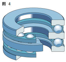 雙向角接觸推力球軸承 在雙向軸承的設(shè)計(jì)中(圖2),承載能力較高的上軸承與相反方向上的較小軸承結(jié)合,組成一個(gè)單元。這類軸承的高度低,除力矩負(fù)荷外也能承受雙向軸向負(fù)荷。 所以一個(gè)單一的軸承能用于支承相對(duì)靜止的旋轉(zhuǎn)機(jī)器部件。這些雙向軸承同樣也采用分離型設(shè)計(jì)。